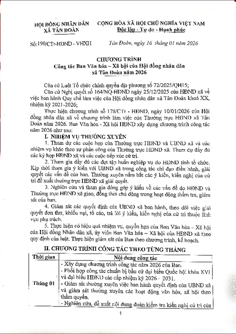 | Tiêu đề văn bản | Chương trình công tác của Ban VHXH HĐND xã Tân Đoàn năm 2026 | ||