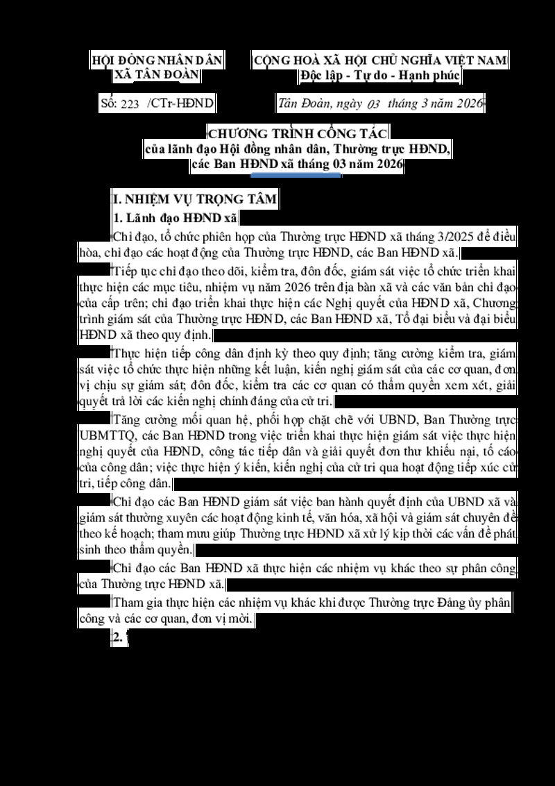 | Tiêu đề văn bản | Chương trình công tác của lãnh đạo HĐND, các Ban HĐND xã tháng 3 năm 2026 | ||