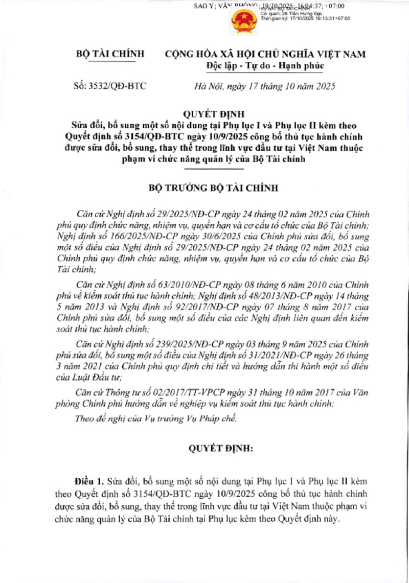 | Tiêu đề văn bản | Quyết định sửa đổi, bổ sung một số nội dung Quyết định số 3154/QĐ-BTC ngày 10/9/2025 công bố thủ tục hành chính được sửa đổi, bổ sung, thay thế trong lĩnh vực đầu tư tại Việt Nam thuộc phạm vi chức năng quản lý của Bộ Tài chính | ||