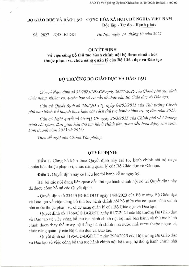 | Tiêu đề văn bản | Quyết định về việc công bố thủ tục hành chính nội bộ được chuẩn hoá thuộc phạm vi, chức năng quản lý của Bộ Giáo dục và Đào tạo | ||