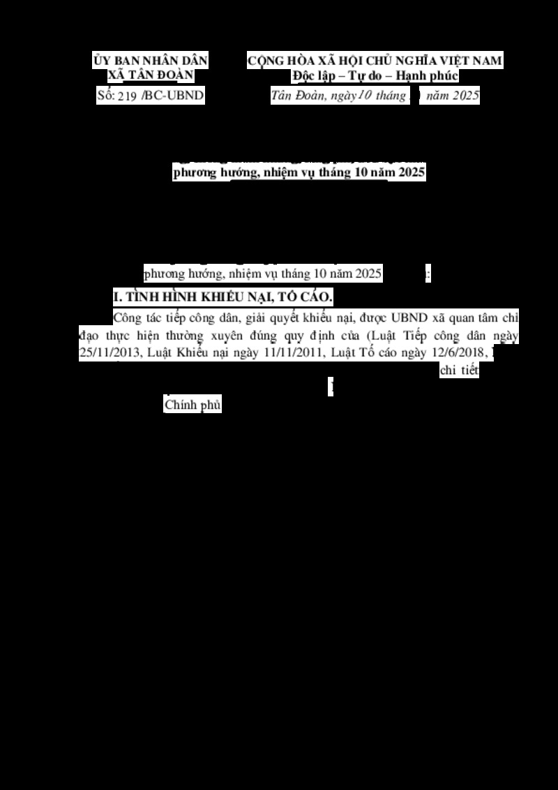| Tiêu đề văn bản | Báo cáo Kết quả công tác tiếp công dân, giải quyết khiếu nại, tố cáo, nội chính và phòng, chống tham nhũng, lãng phí, tiêu cực tháng 9 và phương hướng, nhiệm vụ tháng 10 năm 2025 | ||