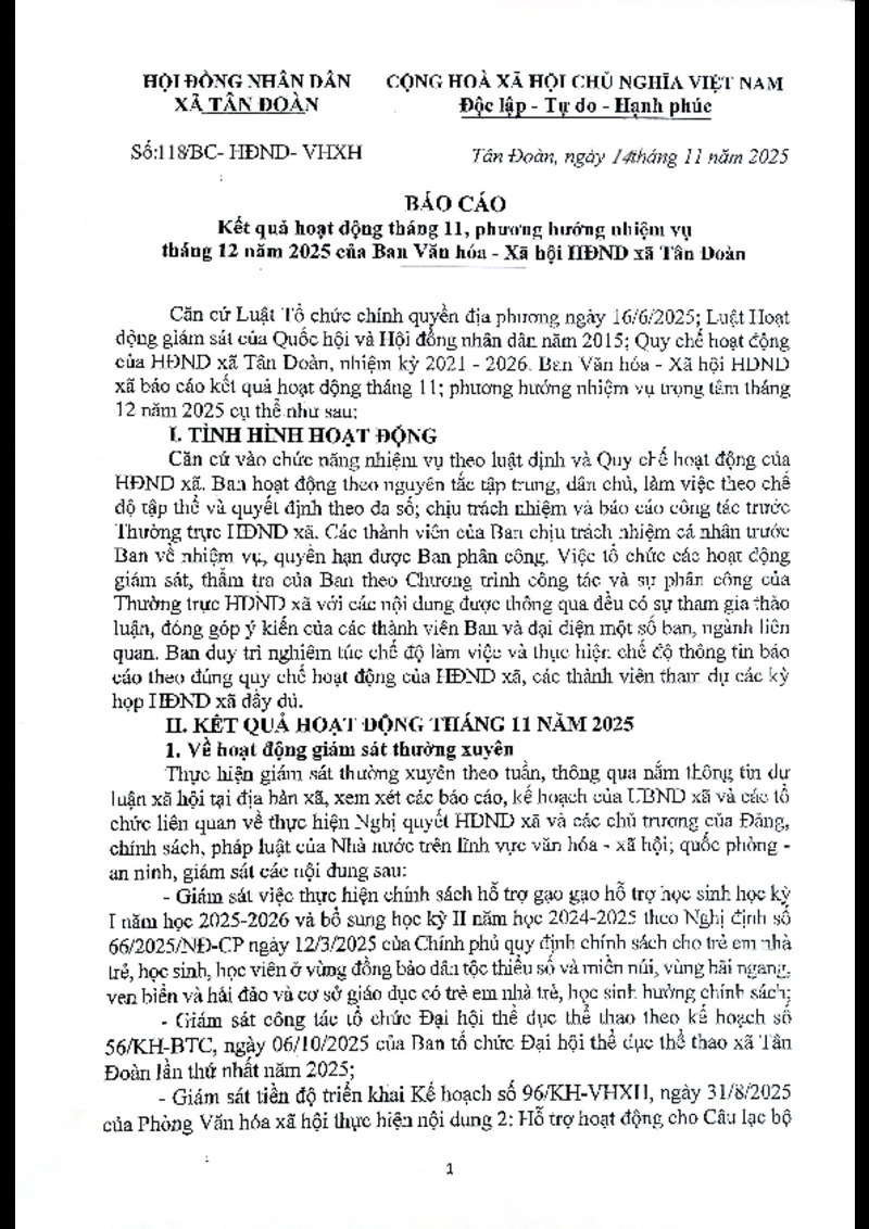 | Tiêu đề văn bản | Báo cáo kết quả tháng 11, nhiệm vụ tháng 12 năm 2025 của Ban Văn Hóa - Xã hội HĐND xã | ||