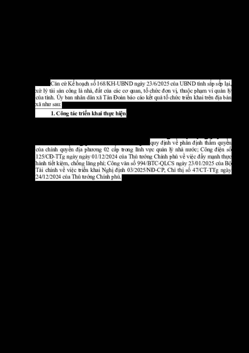 | Tiêu đề văn bản | Báo cáo Kết quả thực hiện rà soát và đề nghị phê duyệt phương án sắp xếp lại, xử lý nhà, đất thuộc Ủy ban nhân dân xã Tân Đoàn | ||