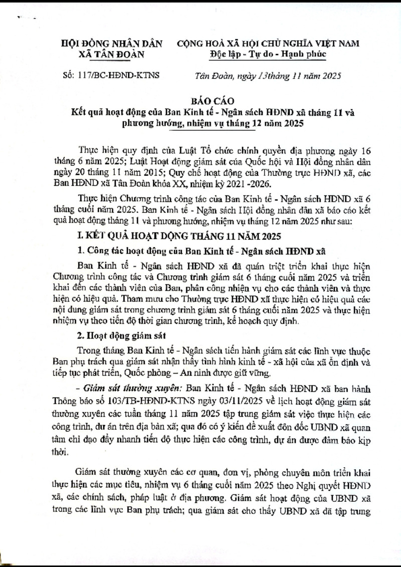 | Tiêu đề văn bản | BC kết quả hoạt động của Ban Kinh tế - Ngân sách HĐND xã tháng 11 và phương hướng, nhiệm vụ tháng 12 năm 2025 | ||
