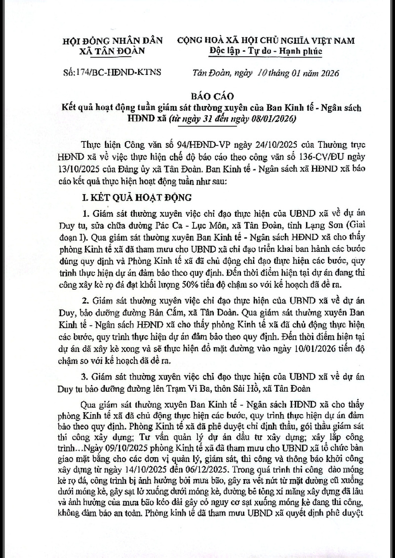 | Tiêu đề văn bản | BC Kết quả hoạt động tuần giám sát thường xuyên của Ban Kinh tế - Ngân sách HĐND xã (từ ngày 31 đến ngày 08/01/2026) | ||