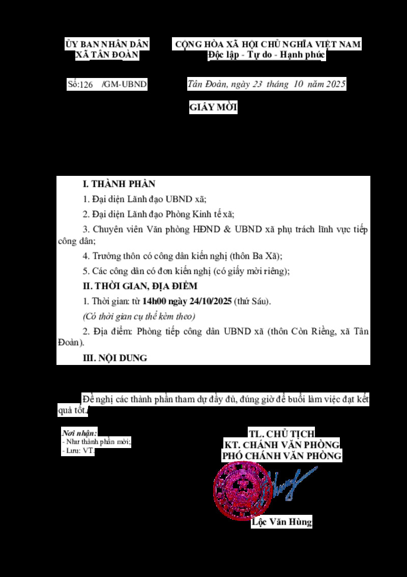 | Tiêu đề văn bản | Giấy mời giải quyết đơn thư thôn Ba Xã - 10/2025 | ||