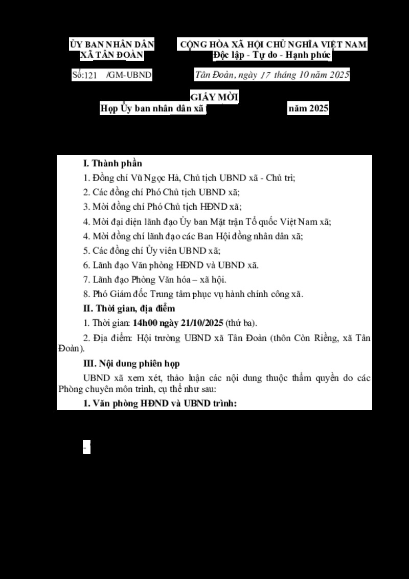 | Tiêu đề văn bản | GIẤY MỜI Họp Ủy ban nhân dân xã thường kỳ tháng 10 năm 2025 | ||
