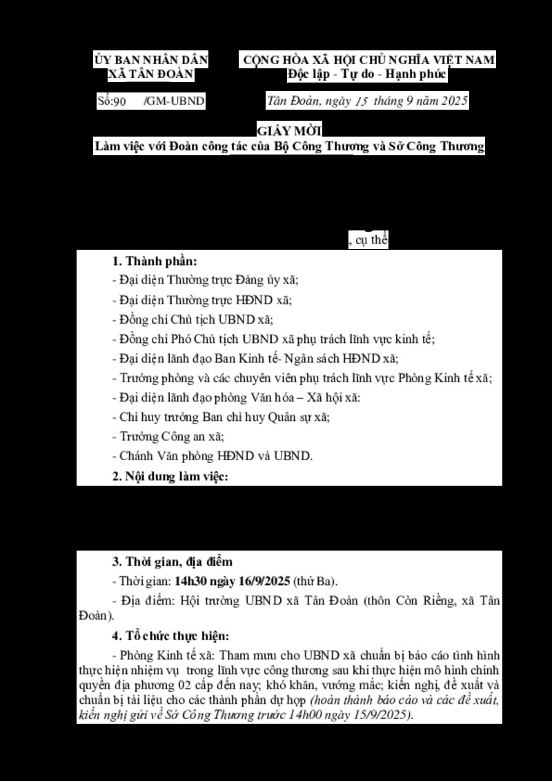 | Tiêu đề văn bản | GIẤY MỜI Làm việc với Đoàn công tác của Bộ Công Thương và Sở Công Thương tỉnh | ||