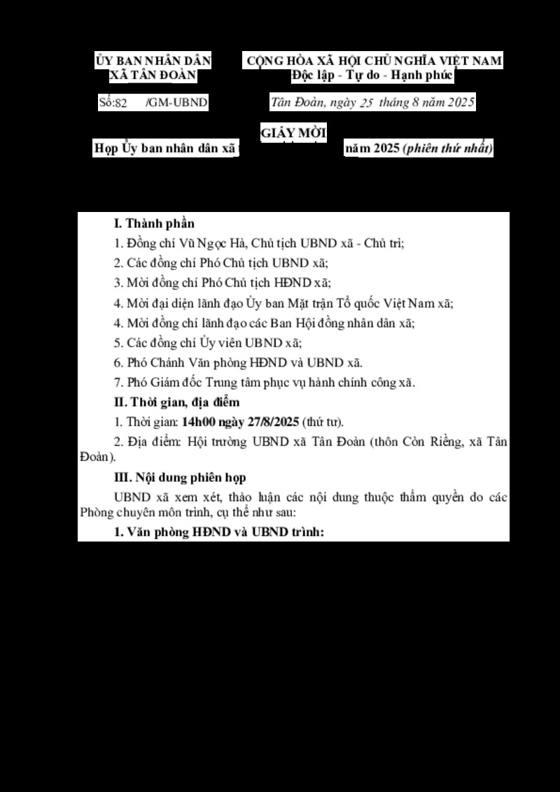| Tiêu đề văn bản | Giấy mời phiên họp UBND xã Tân Đoàn thường kỳ tháng 8/2025 | ||