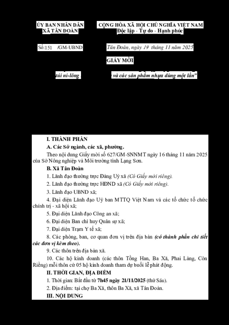 | Tiêu đề văn bản | Về việc tổ chức phát động mô hình "Ngày họp chợ phiên không sử dụng túi ni-lông khó phân hủy và các sản phẩm nhựa dùng một lần" xã Tân Đoàn | ||