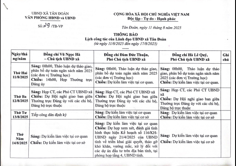 | Tiêu đề văn bản | THÔNG BÁO Lịch công tác của Lãnh đạo UBND xã Tân Đoàn (từ ngày 11/8/2025 đến ngày 17/8/2025) | ||