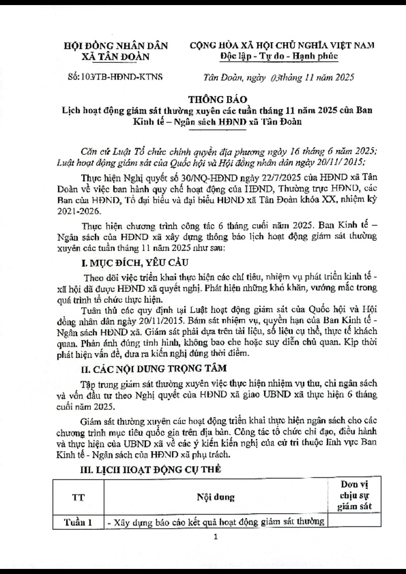 | Tiêu đề văn bản | Thông báo Lịch hoạt động giám sát thường xuyên các tuần tháng 11 năm 2025 của Ban Kinh tế - Ngân sách HĐND xã | ||