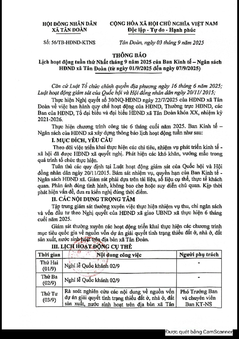 | Tiêu đề văn bản | Thông báo Lịch hoạt động tuần thứ Nhất tháng 9-2025 của Ban KT-NS HĐND xã | ||