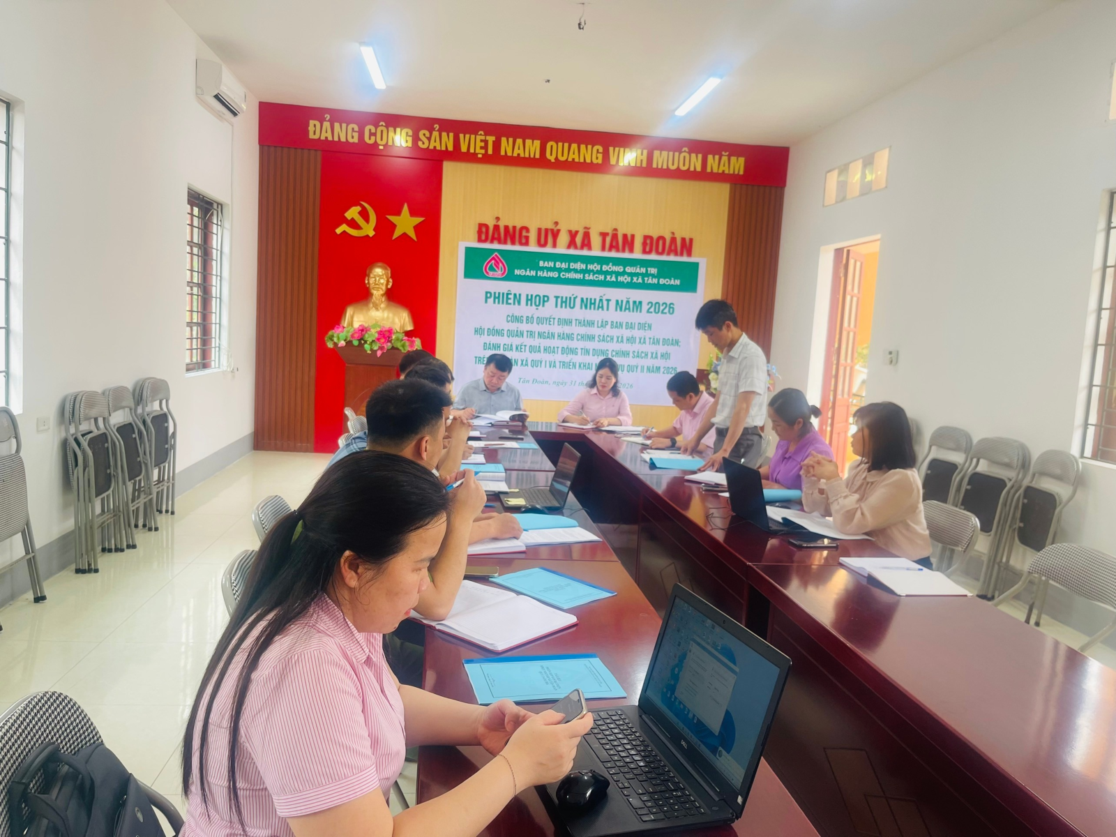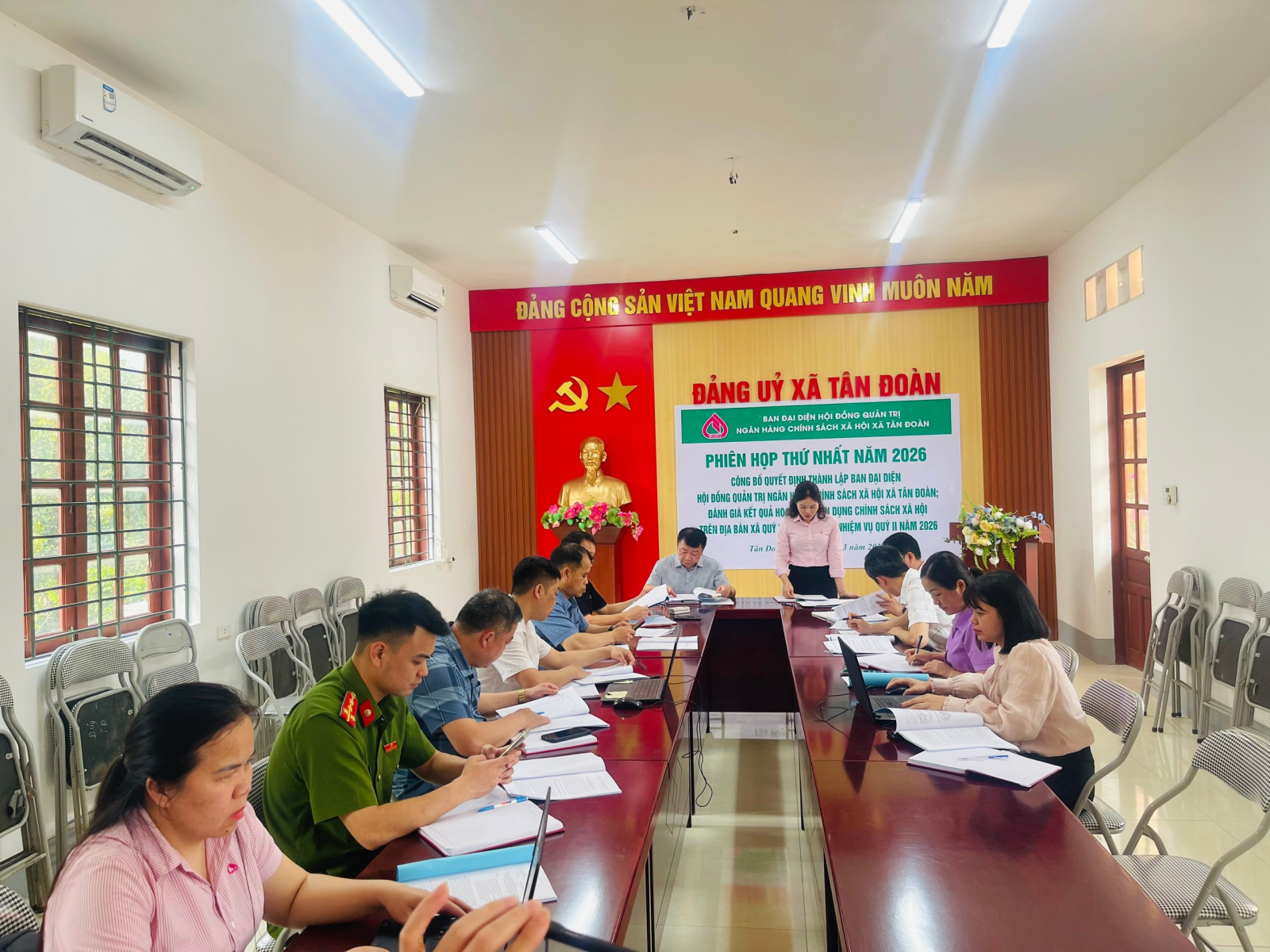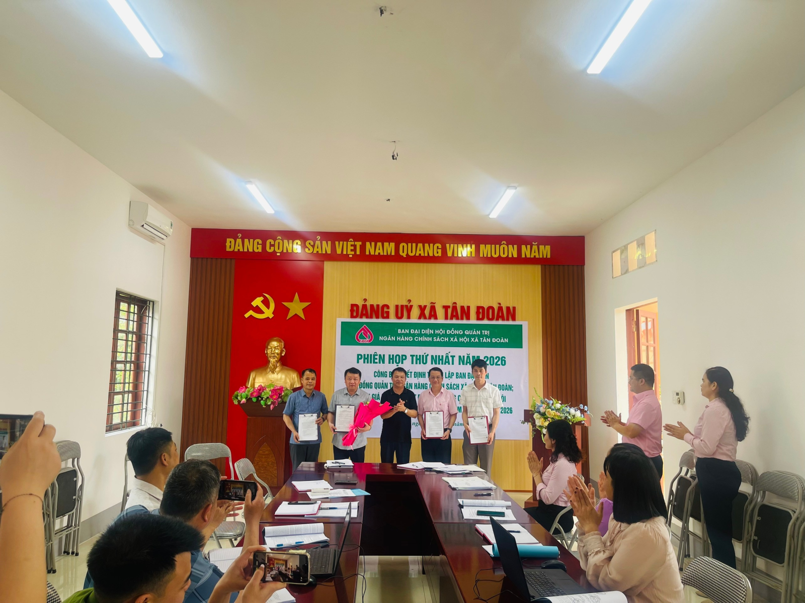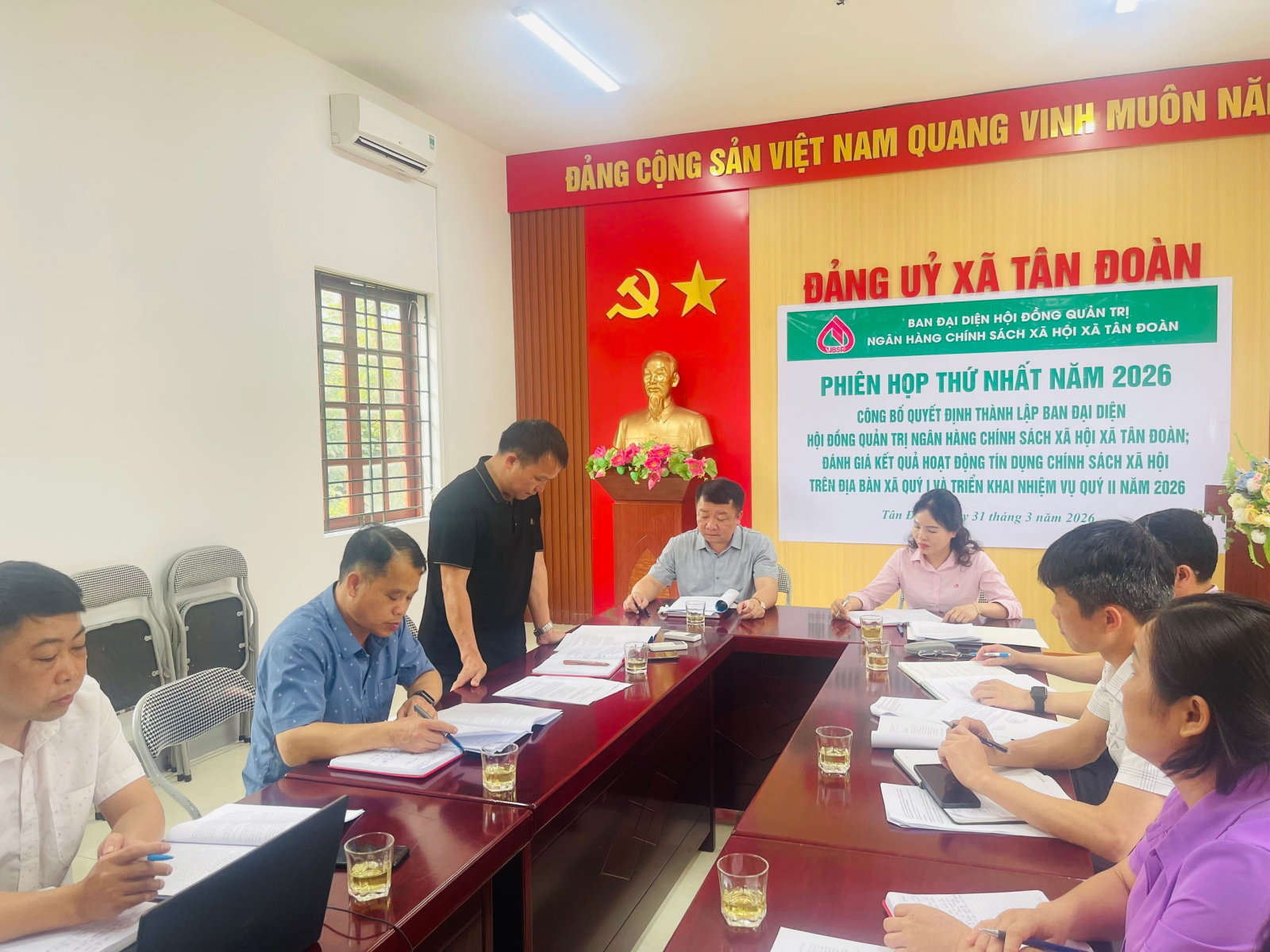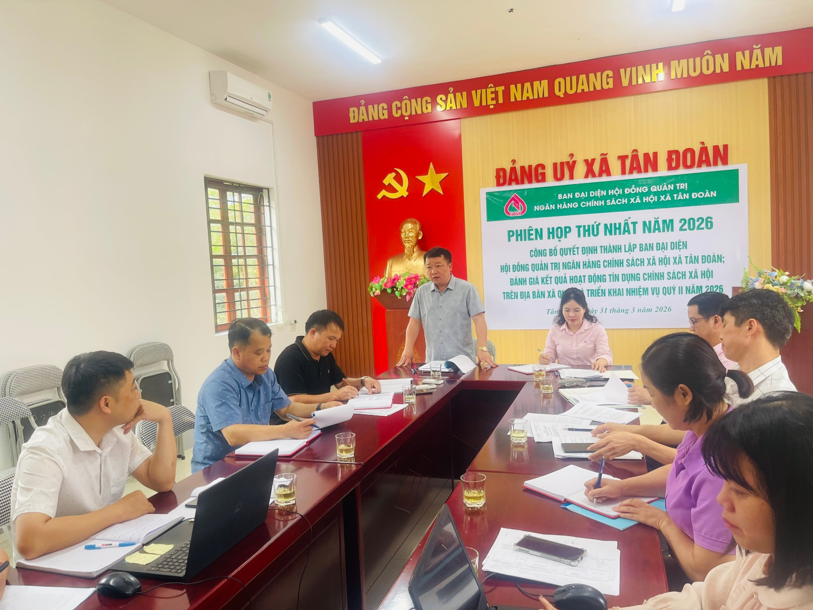 Ngày 31/3/2026, tại phòng họp tầng 2 trụ sở Đảng uỷ xã Tân Đoàn đã diễn ra Hội nghị công bố Quyết định thành lập Ban đại diện Hội đồng quản trị Ngân hàng Chính sách xã hội xã; đồng thời đánh giá kết quả hoạt động tín dụng chính sách quý I và triển khai nhiệm vụ quý II năm 2026.