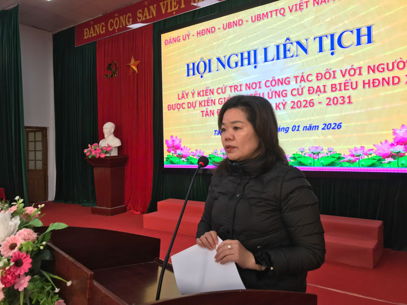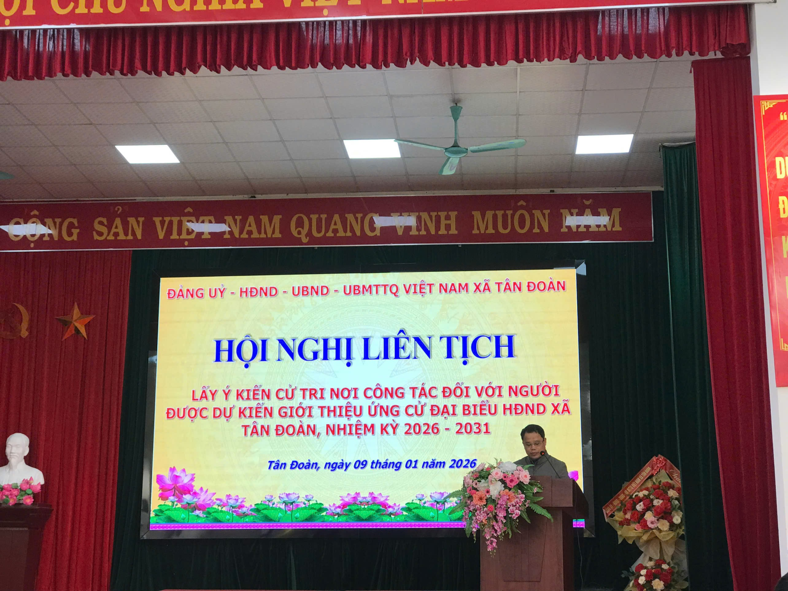 Sáng ngày 09/01/2026, tại Hội trường UBND xã Tân Đoàn, Đảng ủy, Hội đồng nhân dân, Ủy ban nhân dân, Ủy ban Mặt trận Tổ quốc Việt Nam xã Tân Đoàn phối hợp tổ chức Hội nghị liên tịch lấy ý kiến cử tri nơi công tác đối với người được dự kiến giới thiệu ứng cử đại biểu HĐND xã Tân Đoàn, nhiệm kỳ 2026-2031.