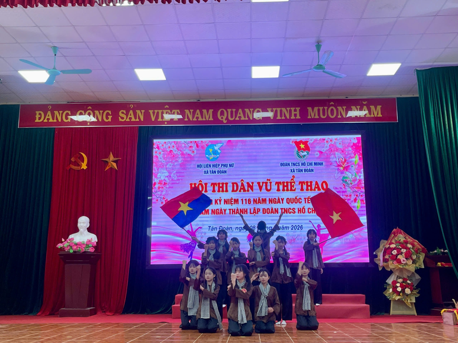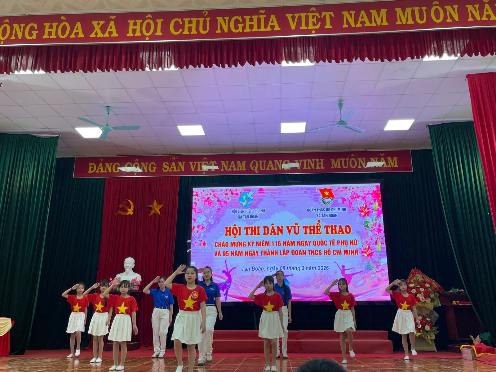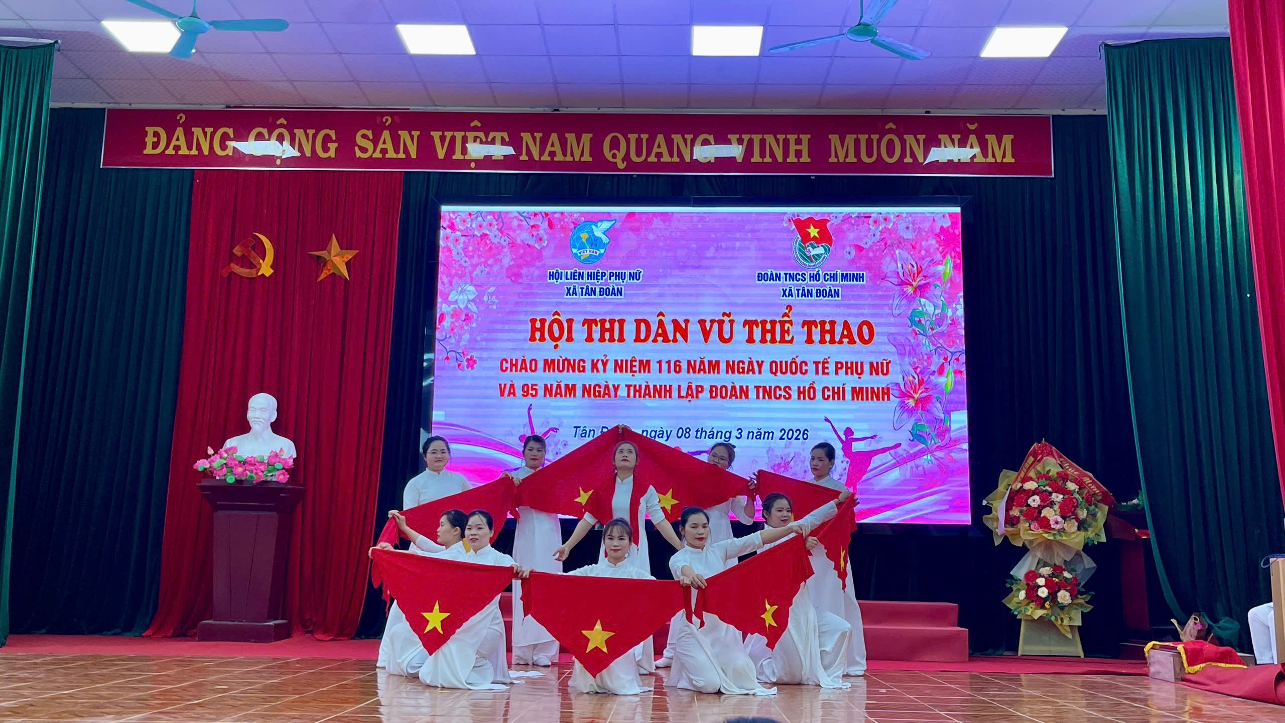 Thiết thực lập thành tích chào mừng Ngày bầu cử đại biểu Quốc hội khóa XVI và đại biểu HĐND các cấp nhiệm kỳ 2026 – 2031, kỷ niệm 116 năm Ngày Quốc tế Phụ nữ (08/3/1910 – 08/3/2026) và 95 năm Ngày thành lập Đoàn TNCS Hồ Chí Minh (26/3/1931 – 26/3/2026), đồng thời nhằm tạo sân chơi lành mạnh, bổ ích, góp phần nâng cao đời sống văn hóa tinh thần, rèn luyện sức khỏe và tăng cường sự gắn kết trong cán bộ, hội viên, đoàn viên và thiếu nhi trên địa bàn, ngày 08/3/2026, Hội Liên hiệp Phụ nữ xã Tân Đoàn phối hợp với Đoàn TNCS Hồ Chí Minh xã Tân Đoàn đã tổ chức Hội thi dân vũ năm 2026 với chủ đề “Đoàn kết – Khỏe – Đẹp – Sáng tạo”.