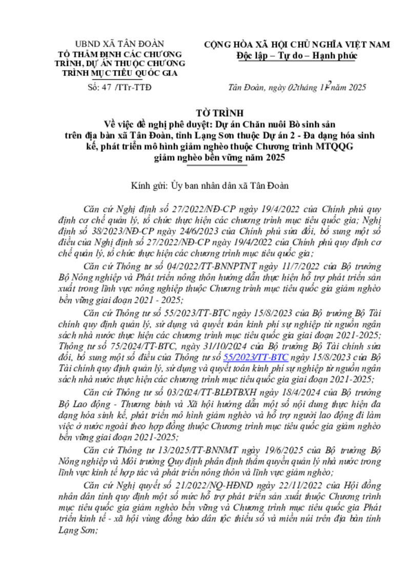 | Tiêu đề văn bản | Về việc đề nghị phê duyệt: Dự án Chăn nuôi Bò sinh sản trên địa bàn xã Tân Đoàn, tỉnh Lạng Sơn thuộc Dự án 2 - Đa dạng hóa sinh kế, phát triển mô hình giảm nghèo thuộc Chương trình MTQQG giảm nghèo bền vững năm 2025 | ||